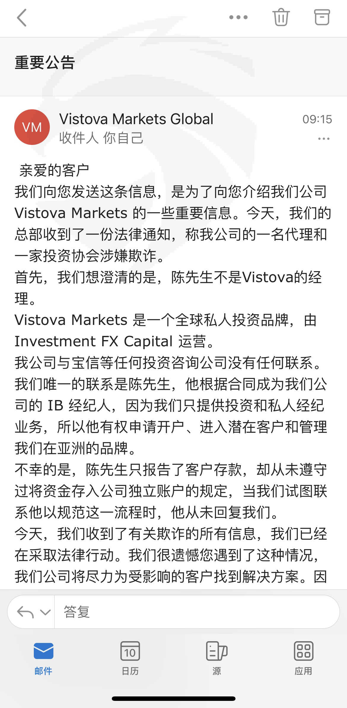 Vistova 发送了一份公报。陈先生和宝信集团是骗子。