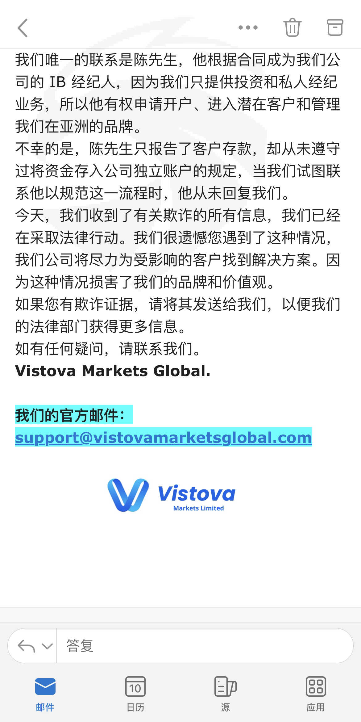 今天我收到了一封来自 Vistova 的电子邮件,他们向我解释说陈先生并不是公司的总经理,他只是一个介绍客户的代理。陈先生和宝信集团实施了诈骗,偷走了我的钱。