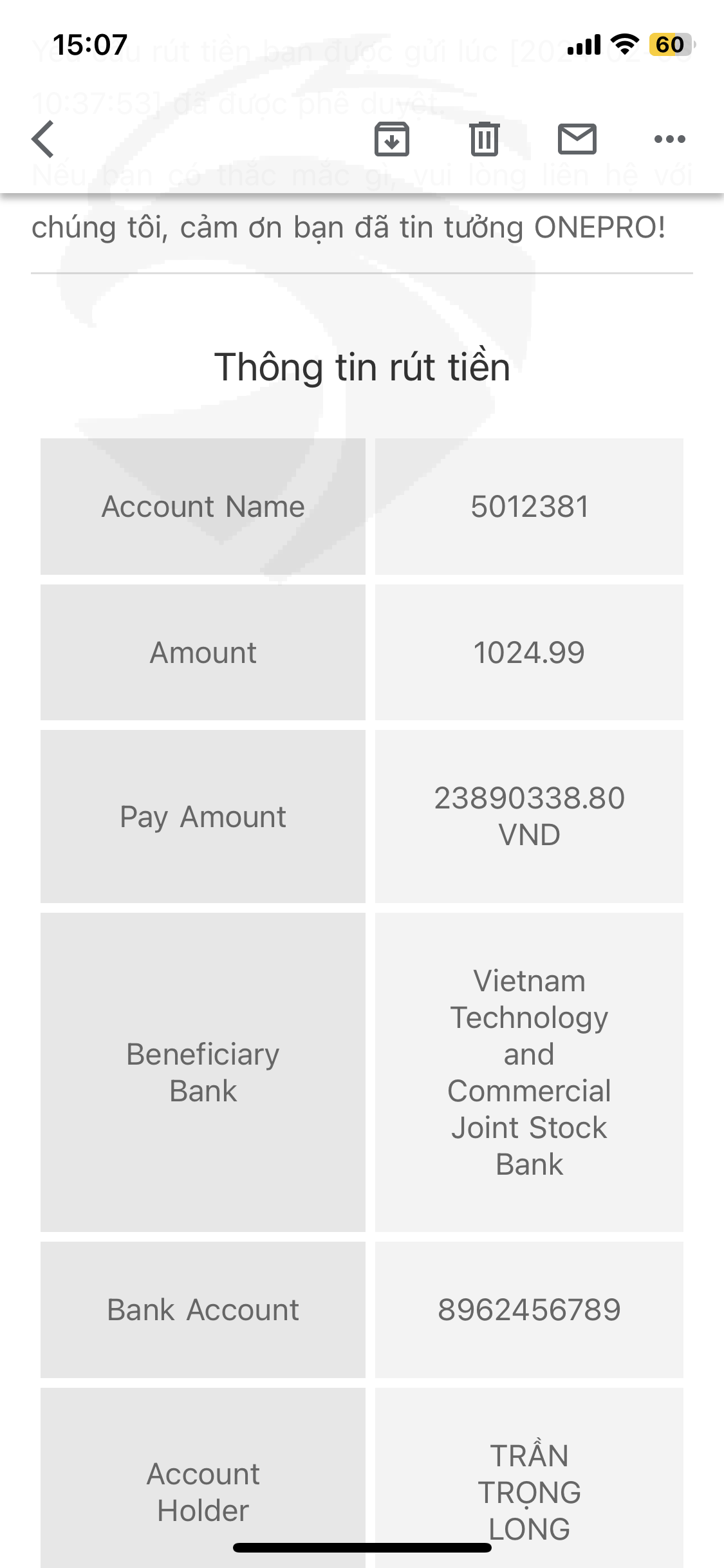 地面 OnePro我下了提款单,钱从 mt4 中扣除,但付款没有发送到我的银行账户。不支持支持消息。诈骗的迹象很明显。 mt4现在还是落后的。希望管理员支持你