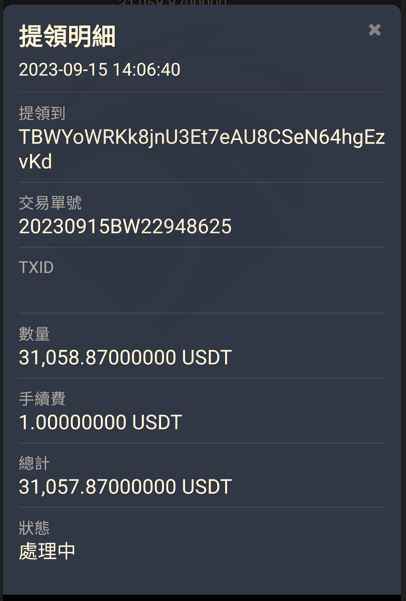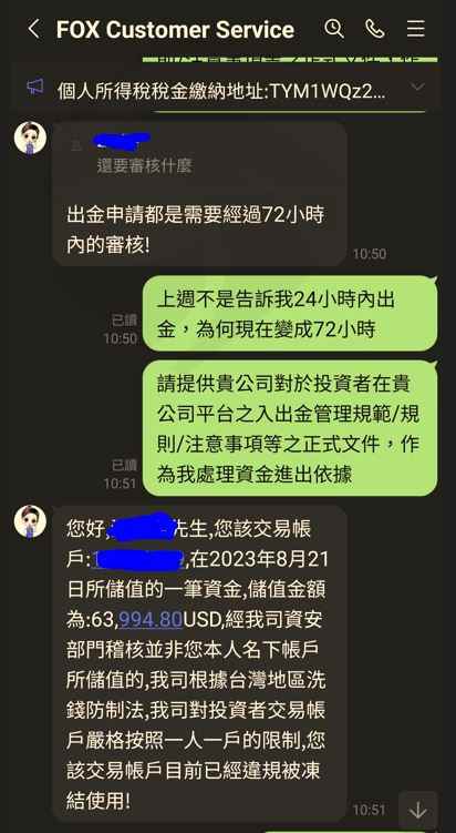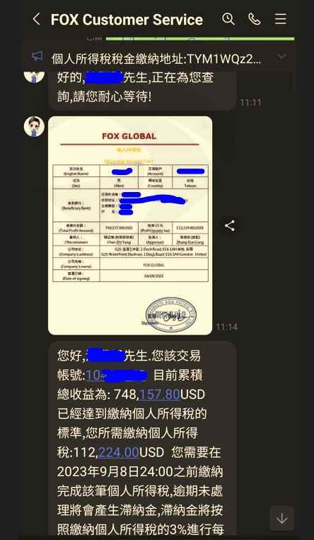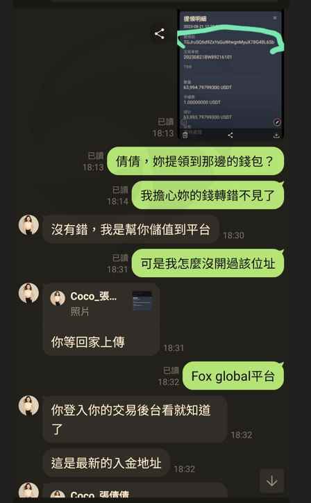透過Tinder認識女性網友並交換Line ID進一步認識深入聊天以結婚為前提下, 女方提到蜜月旅行所費不貲, 進而介紹本人投資美股指數賺大錢女性網友介紹使用Fox Global交易平台(以USDT)投資外匯 本人資金入出金歷程(幣託-Fox Global), 大筆資金流入Fox Global平台之個人帳戶, 僅早期一筆小額資金(USDT168)成功出金到幣託(Pitopro)本人經過一段時間投資操作Fox Global平台, 並獲利後首度申請出金USDT1,000,0004.3 本人收到Fox Global客服要求先繳納所得稅金USDT112,224, 方能收到所提出之出金金額及再次提領帳戶餘額, 若過期限不繳納則需補繳3%滯納金(每天)成功繳納所得稅金到 Fox Global指定之虛擬錢包地址女性網友自稱幫本人提高投資本金, 主動提領其幣託帳戶資金到我的Fox Global個人平台並提供資金憑證作為證明本人承諾待我能從Fox Global出金投資獲利及本金後, 隨即將借款(USD63,994.8)返還女性網友, 並經女性確認且同意此方式Fox Global客服要求本人必須對該筆非本人名下儲值金USD63,994.8以本人名義進行重新儲值, 方能重新啟動所提之出金申請流程此時啥驚覺被騙