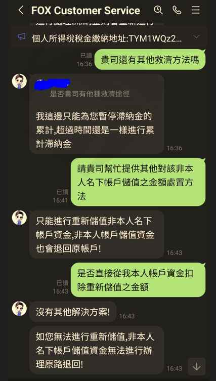 我是透過交友網站認識女性網友,該網友介紹我使用Fox Global外匯交易平台投入了一百萬至今不給出金,我多方思慮後才下了沉重決定繳納代繳服務費並最後一次選擇相信券商,結果還是無法出金