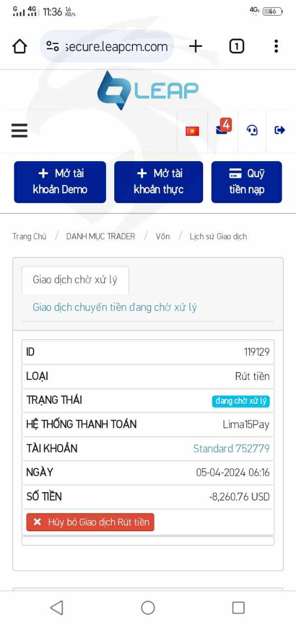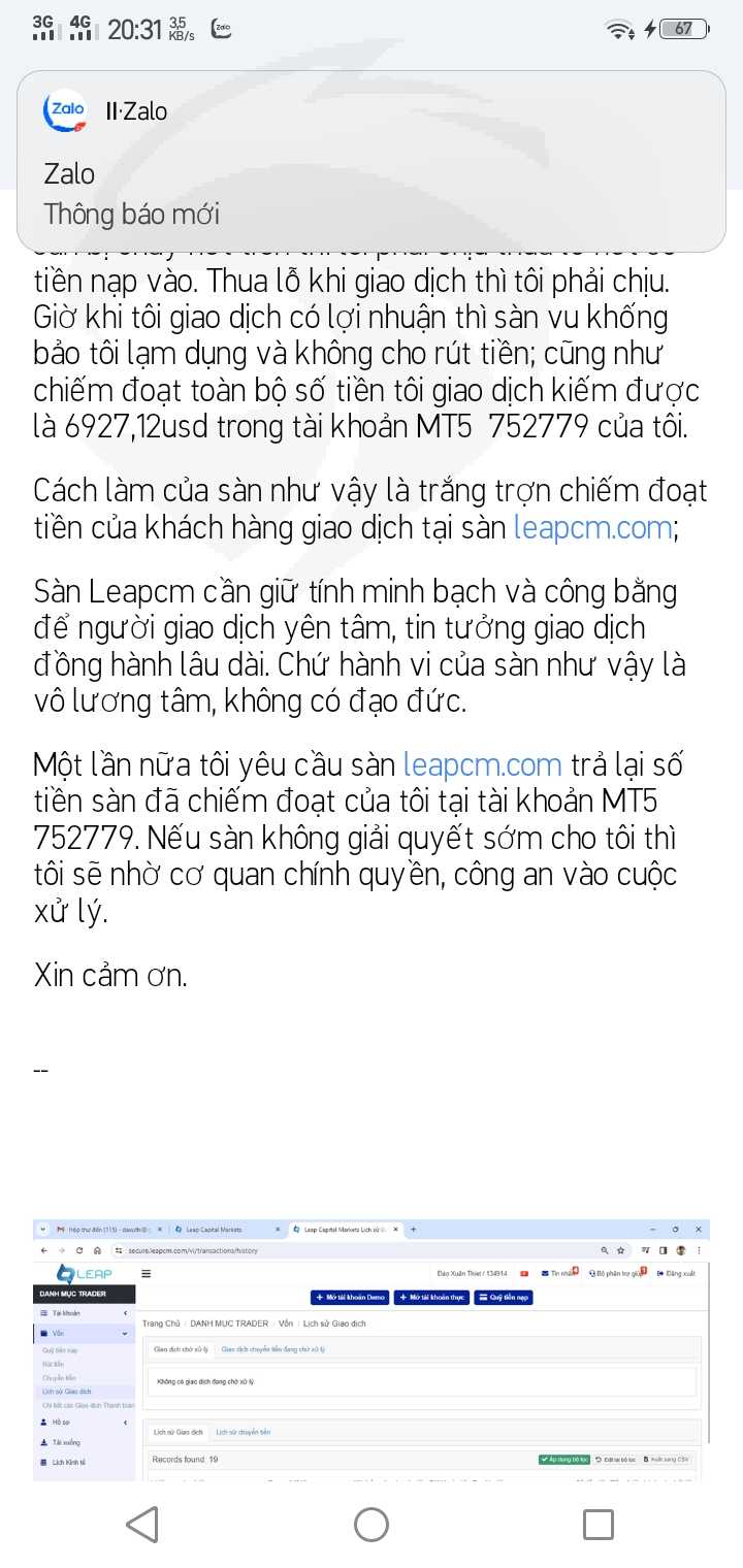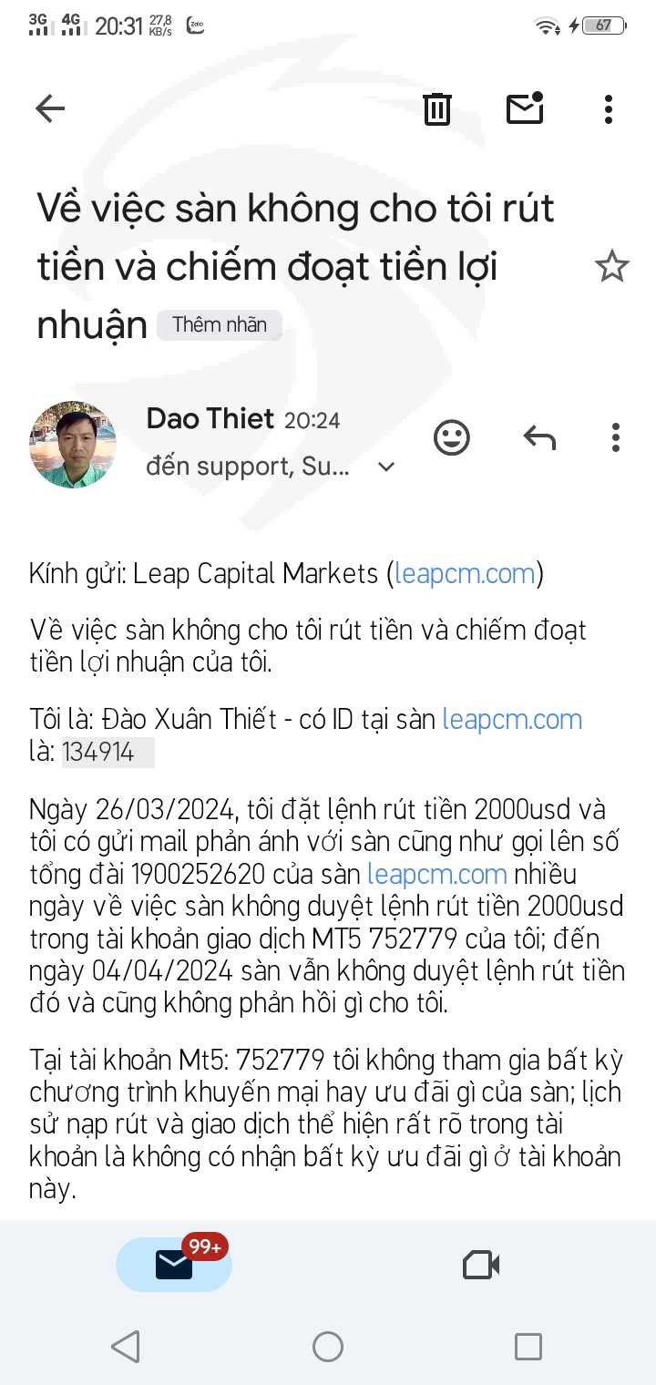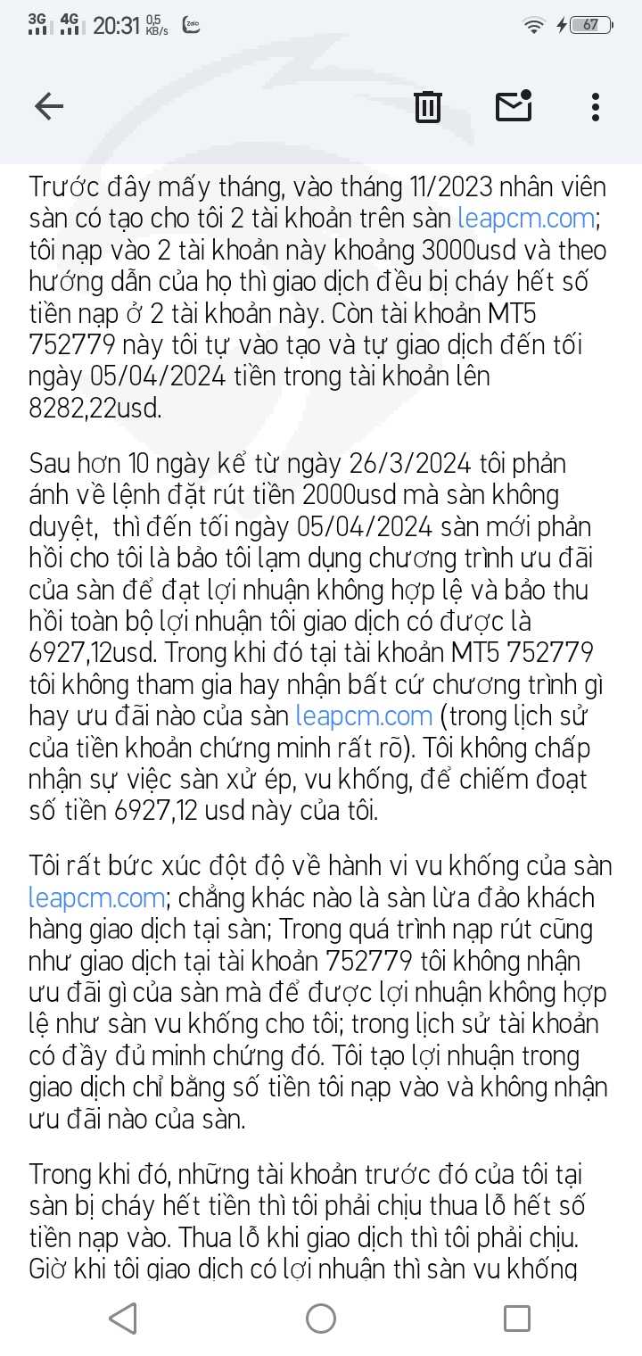 Sàn leap catital markets (leapcm.com) xử ép, vu khống, chiếm đoạt tiền của tôi là 6927,12usd