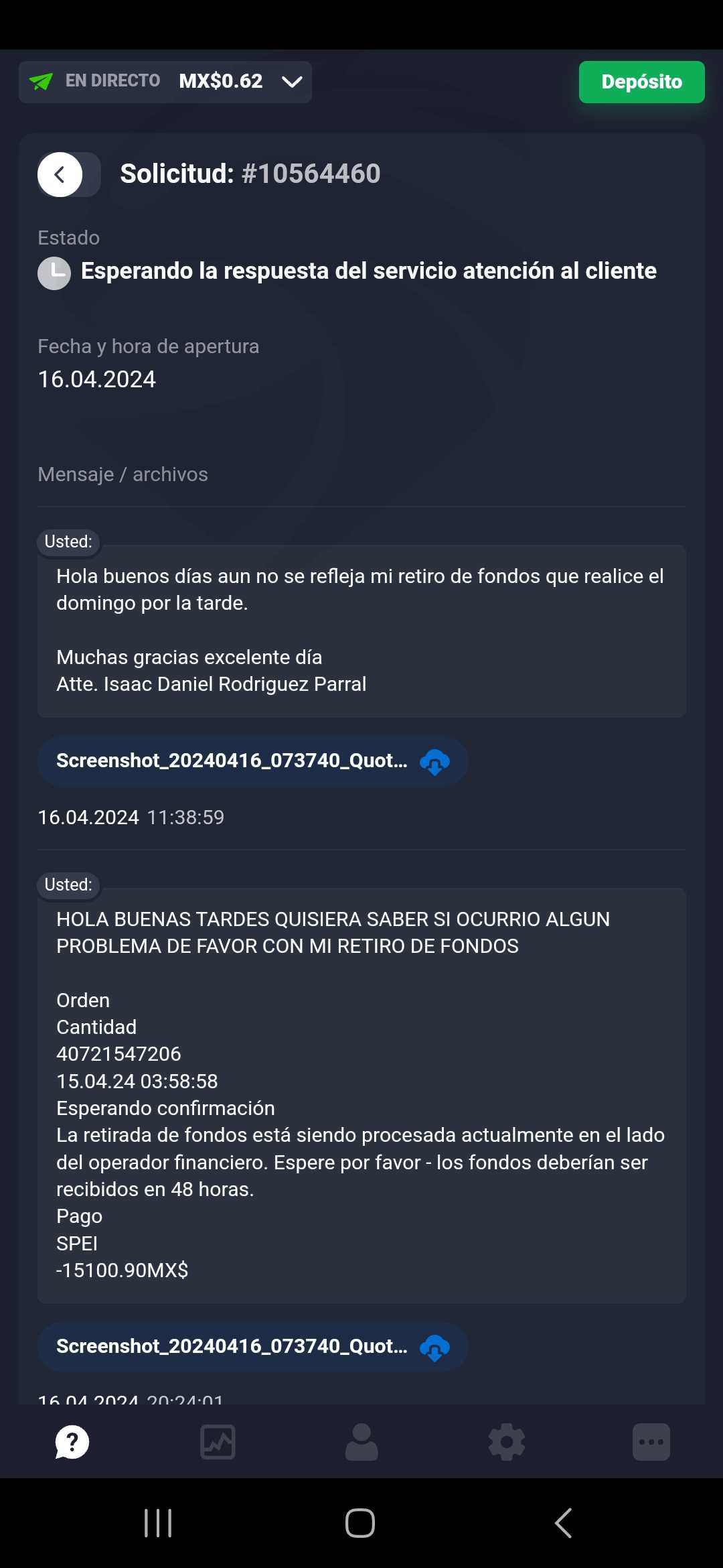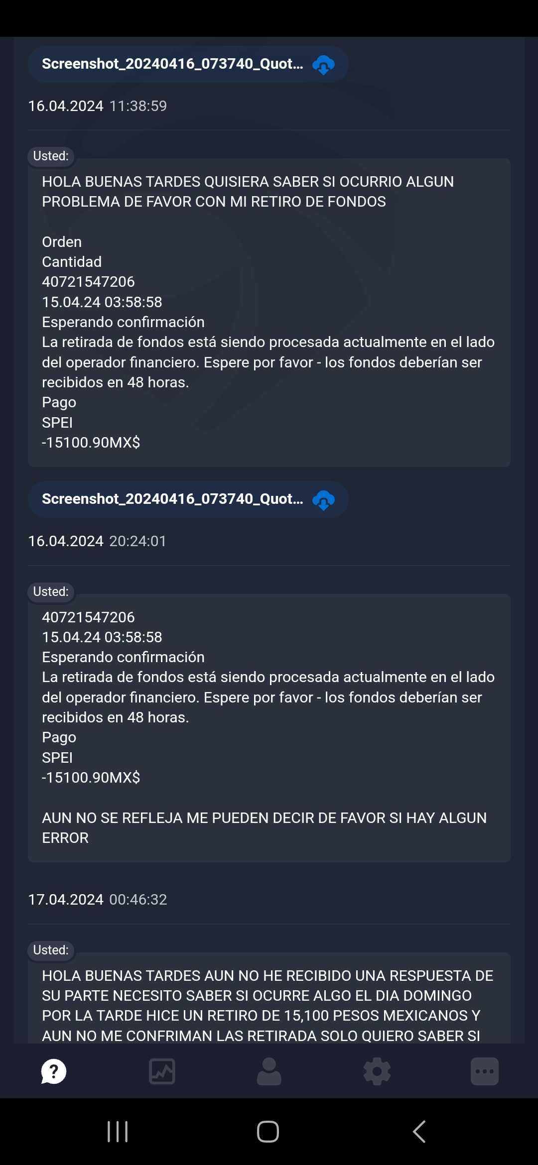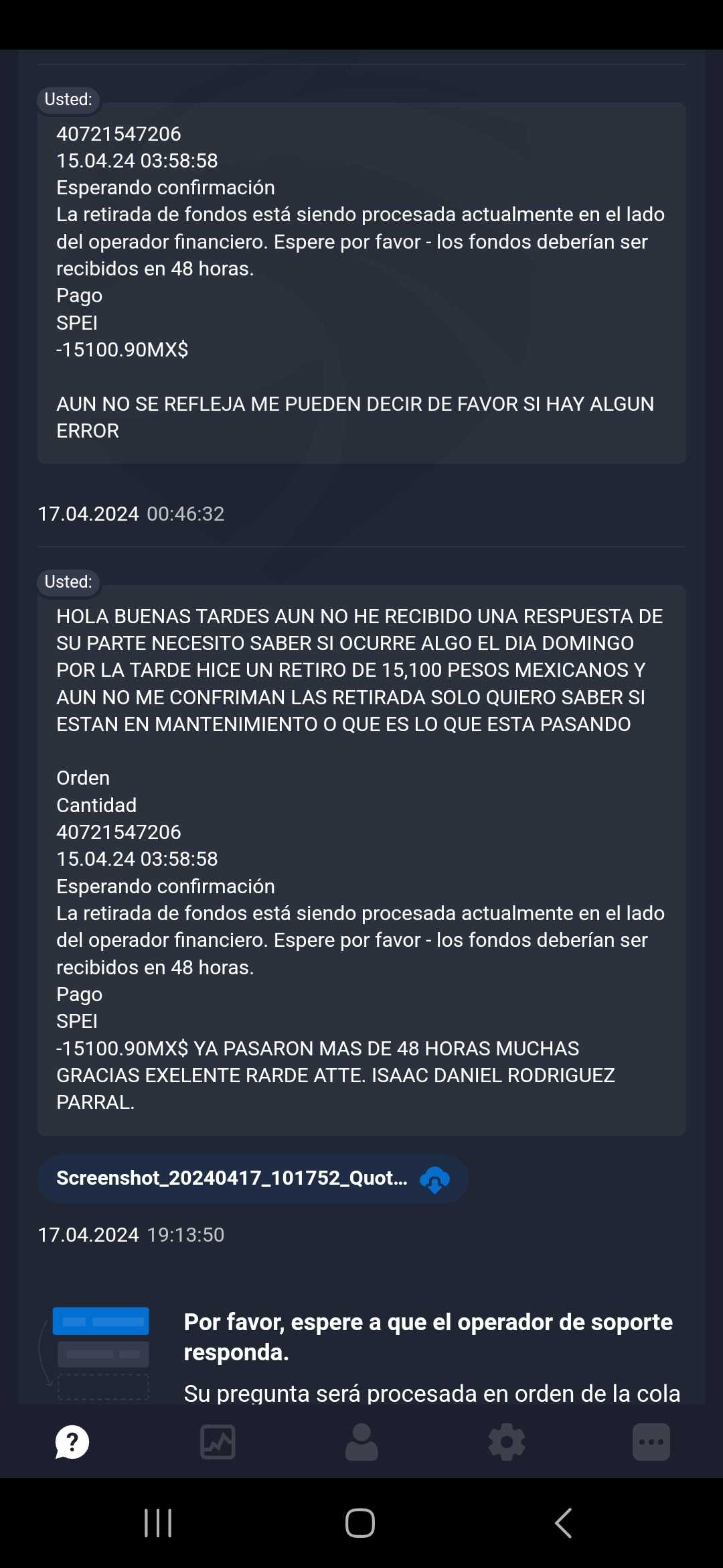 Mi caso hoy en día fue del broker de quotex que me desde más de 8 días no me han contestado sobre un retiro que hice y tampoco me responden las personas de atención al cliente al principio retiraba y todo iba muy bien por que eran montón pequeños y ahora que ya es un monto de acuerdo con todo lo que he invertido y logre recuperar algo de las inversiones que he echo y no me quieren hacer el deposito la verdad es injusto y también hay youtubers que te invitan a entrar en la plataforma como JESUS TRADERS QUIEN TE INVIRA Y QUIERE QUE DEPOSITES A FUERZA Y TE PROMETE HACER OPERACIONES CONTIGO Y SOLO MIENTE Y ASI ESTO QUE ME PASO YO SOLO ESTABA CONFIADO Y DEPOSITE HASTA ME QUEDE ENDEUDADO POR FAVOR AMIGOS TODOS EN GENERAL SI LEEN ESTE MENSAJE NO COMETAN ESTE ERROR POR FAVOR ××QUOTEX×× NO ES CONFIABLE NO CAIGAN EN LA TRANPA POR FAVOR 🙏 NO LES CONVIENE RESPONDER Y LA VERDAD GRACIAS A ESTA EXPERIENCIA YA NO LO VOY HACER MIREN Y VEAN NO RESPONDEN NADA OJALA ME PUEDAN AYUDAR A RECUPERAR ESTO POR FAVOR 🙏
