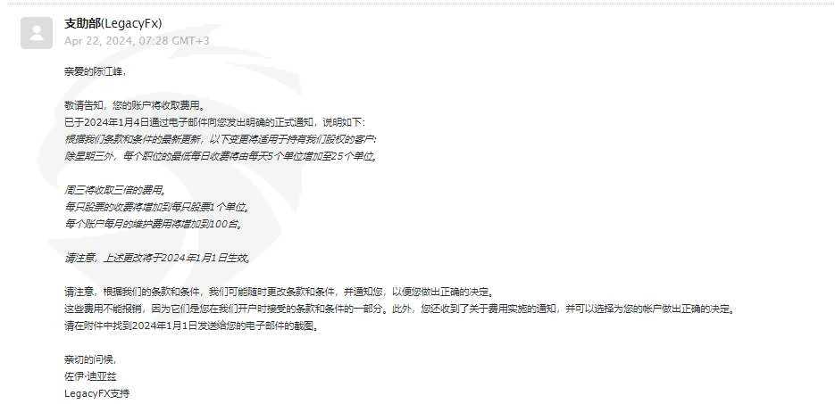 2024年1月1日,legacy在明确邮件通知停止运营的情况下,随意更改客户协议,提高十倍的账户管理费,将我的资金全部侵吞,多次反馈仍然不返还我的本金,行径之恶劣,前所未见。