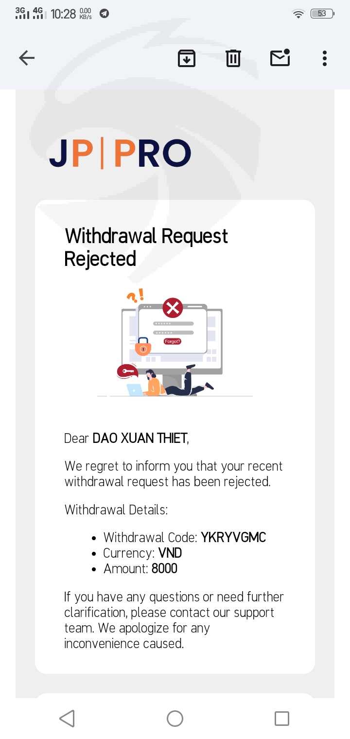 致jprro地板,jppro.com诈骗了我,在mt5账户中挪用了我的钱:401585,该地板没有道德,我正在向国际和越南的警察和金融机构举报这种欺诈行为。操纵mt5价格,欺骗客户;为了杜绝在越南无法经营、挪用客户资金的不道德行为,楼层在我提款时故意取消了提款单,比如有一笔8000usd、25000usd的提款单。.楼层取消了并且没有允许提款。允许场内工作人员进行干扰,对交易客户造成损害。 jppro交易所的总机号码为1900299226。这一事件已经尽一切努力使jppro不再在越南运营。