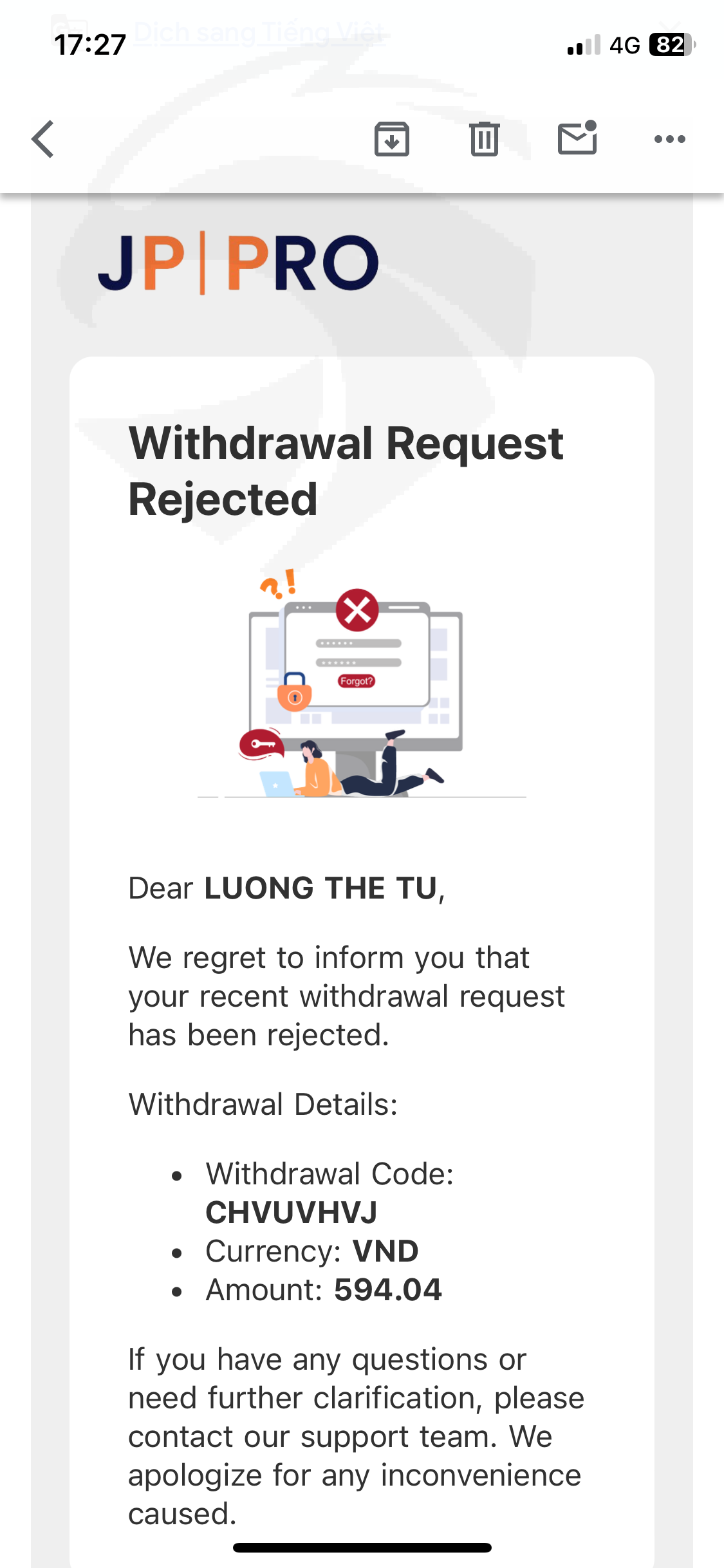 Jppro.com在我的mt5账户406105中欺诈并占用了我的资金。该平台是不道德的。我向警方、国际金融机构以及越南举报了他们占用资金、在mt5上欺诈性调整价格、欺骗客户的行为;为了阻止他们在越南继续操作并且有不道德的占用客户资金的行为,该交易所在我提款时故意取消了提款订单,比如594美元、1135美元的提款订单被取消并且不允许提款。允许交易所员工干扰并对交易客户造成损害。这一事件导致jppro在越南不再运营。