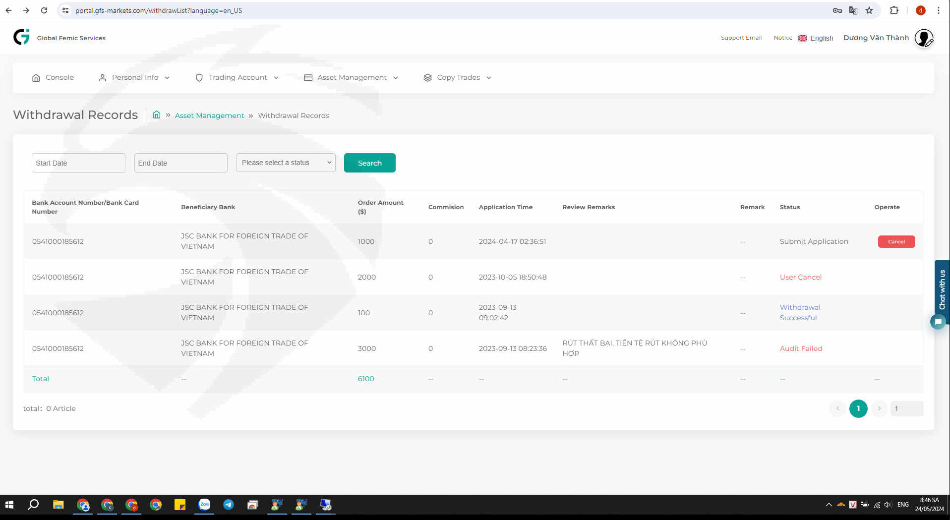tôi không rút được tiền ở sàn về. xin hãy kiểm tra cho tôi. tôi đã gửi mail nhiều lần nhưng đều được phản hồi lại là chờ đợi.