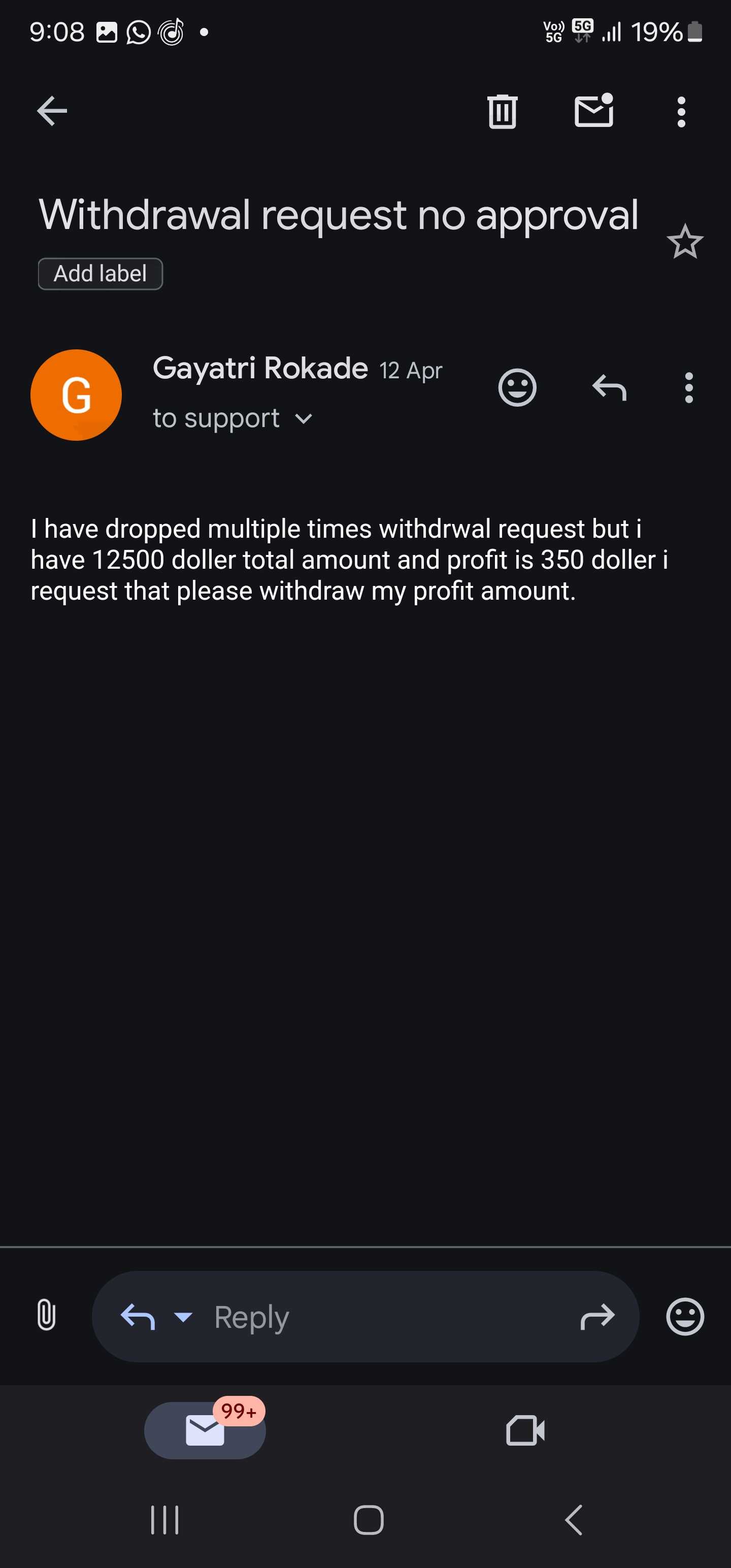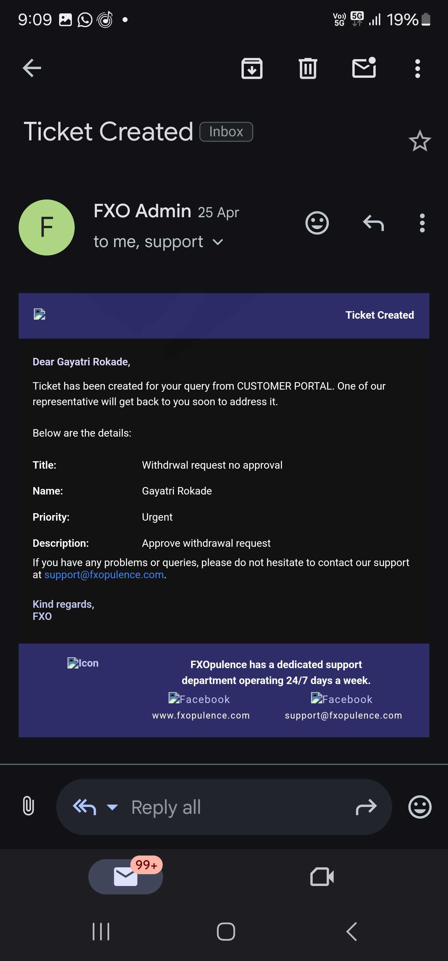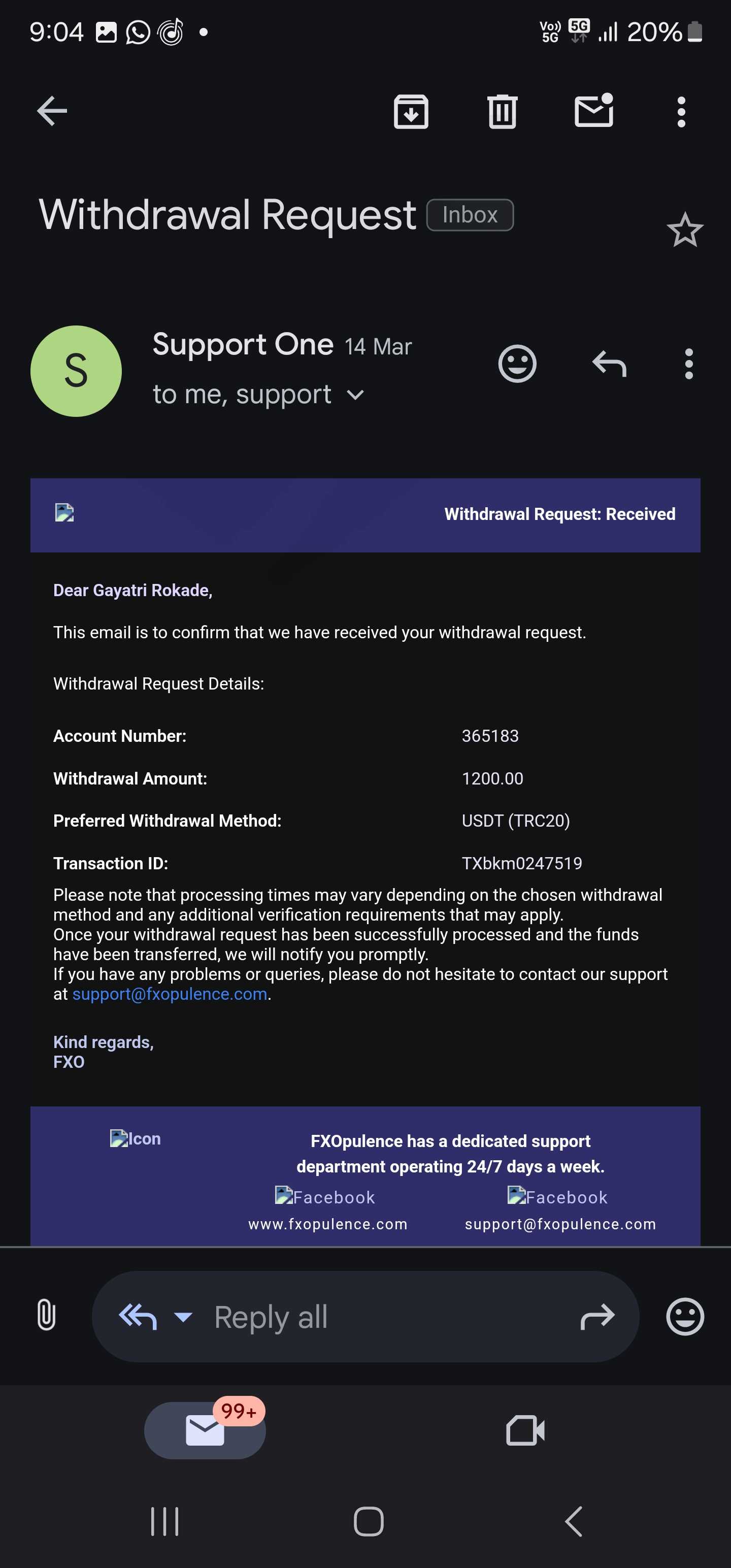 我已经投资了1192140印度卢比,即[13246 USDT],我已经多次发送提款请求,但是这个经纪人无法接受提款请求。这个经纪人给我发邮件说由于网络攻击,无法提取USDT。这个fxopulence经纪人没有给我钱。