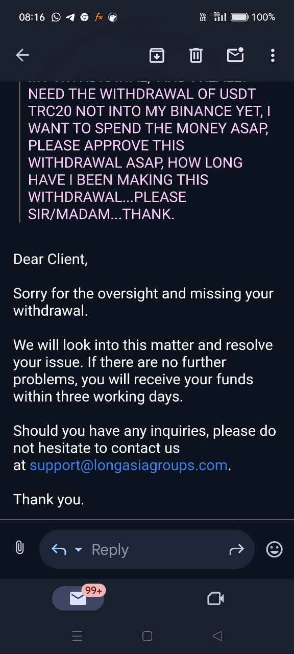 致LONGASIA,我刚刚通过电子邮件(support@longasiagroups.com)发了一条消息。我在2023年11月27日首次出金,到现在都没到账。我问了LONGASIA有关我306.93美金长时间未出金问题,他们在2024年7月3日回复说会在3个工作日处理,但现在还没到账我的TR20钱包。我已经等了7天了,请关注并配合,我急需这笔钱。拜托拜托,谢谢。