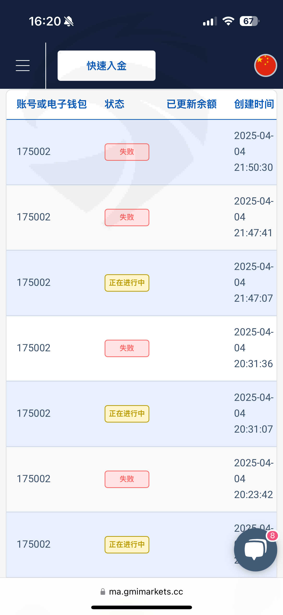 2025年4月4号,周五,北京时间晚上10点左右,我持仓白银加原油,账户2700美金,行情波幅较大,我看着账户有可能有危险怕爆仓,就立刻入金,金额7千到8千,前前后后折腾了一会,尝试了GMI提供的入金渠道,数字货币渠道进去没人接单,银联通道跳转页面没有收款人,最终无法入金导致爆仓,而行情在爆仓后立马大涨,我账户但凡有一次入金成功都不会爆仓,可笑的是,我爆仓后就变一切正常,入金可以正常入了。