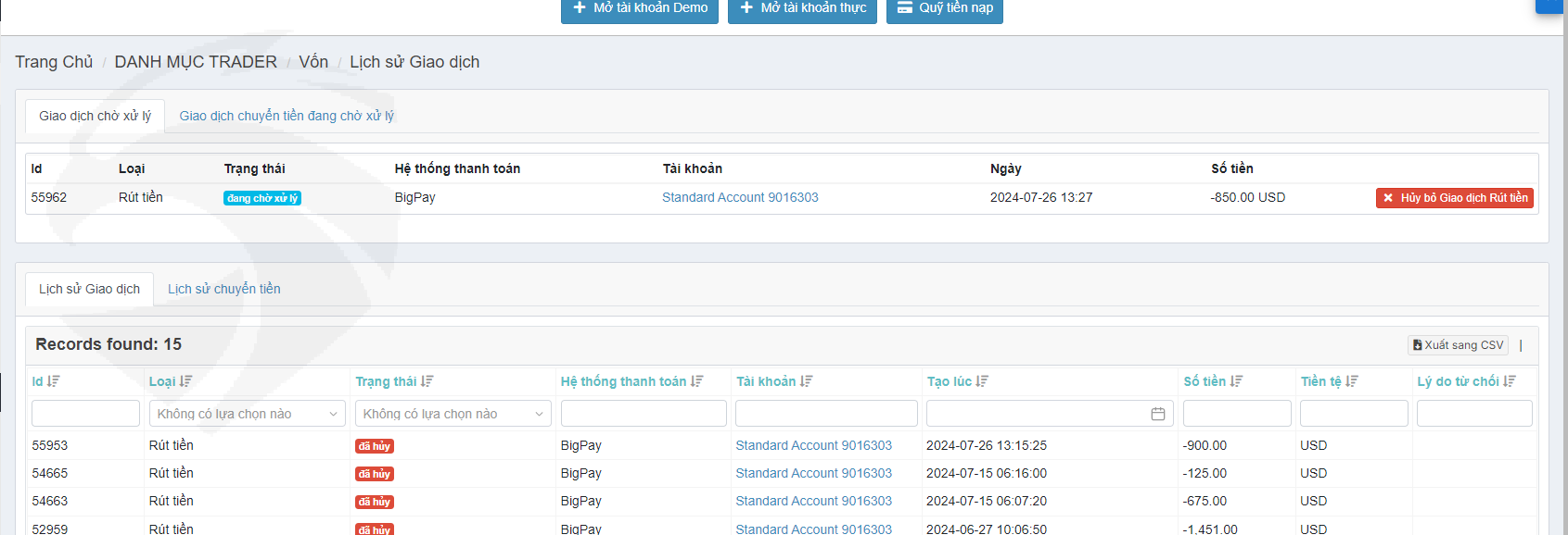 Tôi vào sàn từ 18/6, với vốn 1k, khi vào với hứa hẹn nạp rút tự động, có chuyên gia hỗ trợ riêng kèm cặp trong khi mới đầu tư, nhưng sau vào đầu tư thực. chuyên gia hỗ trợ riêng thường ko liên lạc được. Hoặc cho tín hiệu thì thua nhiều hơn thắng, nên ko tôi ko tin tưởng với hỗ trợ. và định rút tiền vốn. nhưng đặt lệnh rút nhiều lần mà toàn hết 1 tuần ko được. báo lên cskh thì có người báo chuyển bộ phận liên quan, chuyển bộ phận kỹ thuật, chuyển chuyên gia các kiểu, sau lâu lâu có người gọi lại bảo hỗ trợ với điều kiện mua thêm 2 lot sugar, mà m mơi, làm theo, cũng may mà lúc đó ko gd được. chứ không giờ chắc âm vốn. Và giờ tôi vẫn treo tk, ko rút được. Có anh chị nào có thể hỗ trợ giúp tôi ko với ạ. Tôi có ID MT5 9016303