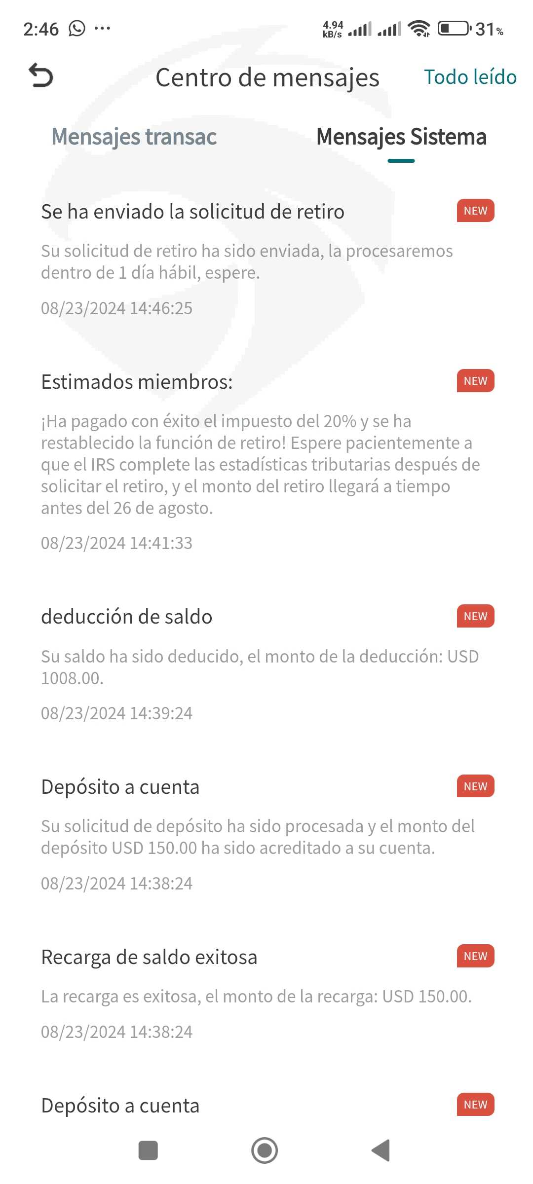 自 2024 年 5 月 6 日起我开始在 NEWRGY IMEX然而,在想要提取我的资金后,他们告诉我,由于涉嫌审计,我不能提取,并要求取消 20% 的税。缴纳税款后,他们允许我提出提款请求,但从未生效。