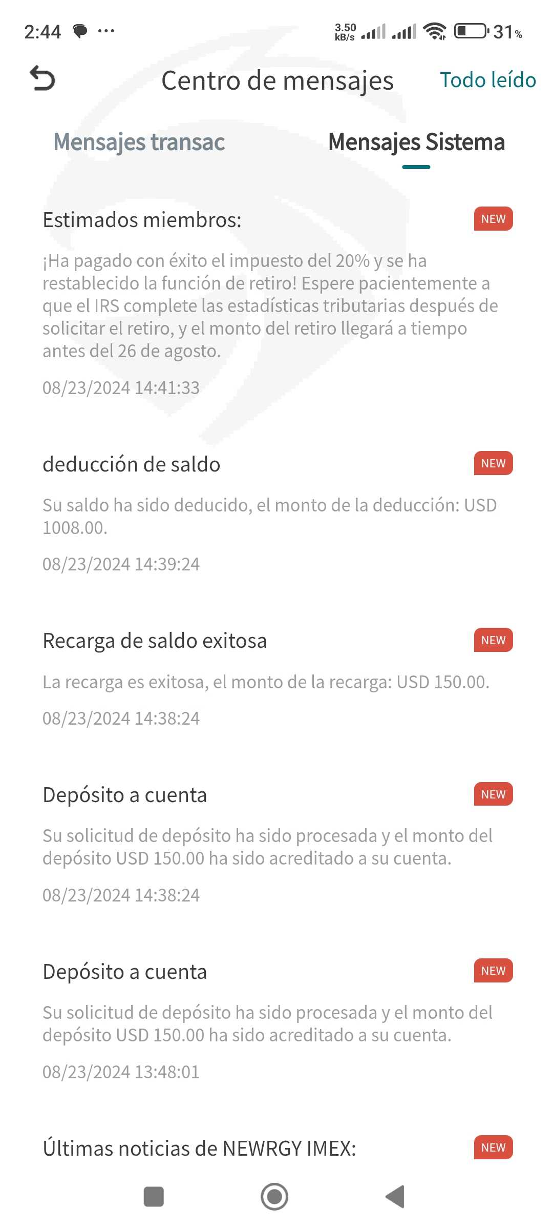 Desde el 05 / 06 / 2024 comencé a operar en Newrgy Imex, sin embargo luego de querer retirar mis fondos me indicaron que no podía por una supuesta auditoría, solicitando cancelar el 20% de impuesto. Una vez cancelado este impuesto, me permitieron realizar la solicitud de retiro sin embargo no se hizo efectivo nunca.