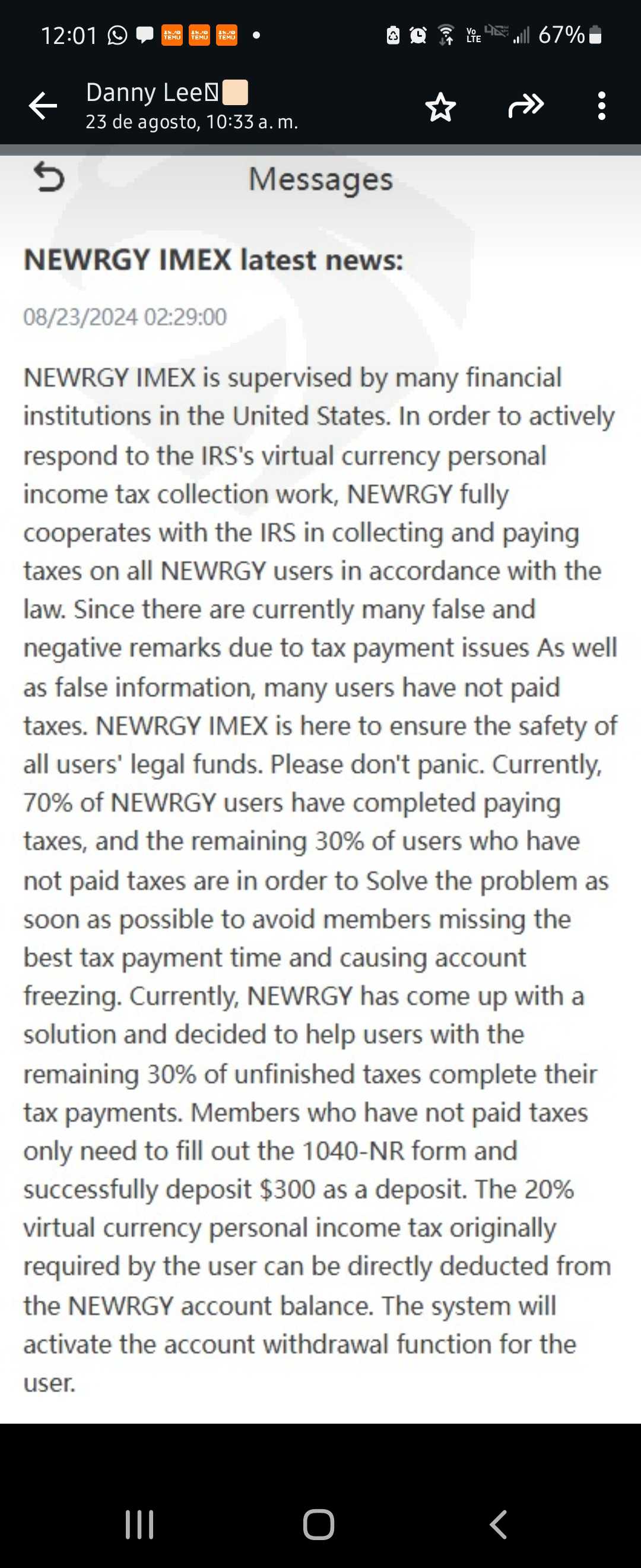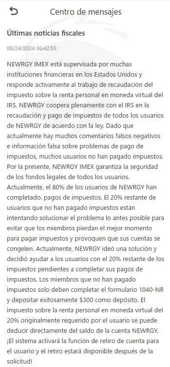 Me inducieron a participar en la inversión este dudoso y fraudulento 'broker" con un monto de 1400USD sin embargo a pesar del supuesto testimonio de algunos usuarios de que ya habían retirado exitosamente, en lo personal la plataforma jamás me permitió hacerlo y fueron aletargado el tiempo de retiro,prometiendo habilitar los retiros el día 16 /08/2024 sin embargo bajo el pretexto de haber entrado en cotizacion de la bolsa de valores de NY, supuestamente el ISR agencia de estados unidos por cierto requirió que todos los usuarios pagasen los impuestos pertinentes de las "ganancias"que la plataforma nos exigió pagar los impuestos supuestamente requeridos por el ISR bajo amenaza de congelar los activos y encima sustraerlos por evasión fiscal antes del 26 de agosto del presente año, acto seguido, estos despreciables y malditos estafadores eliminaron el sitio web y por tanto acceso a cuenta de app de Newrgy Imex , definitivamente voy a presentar denuncia total, cuidado con estos ladrones.