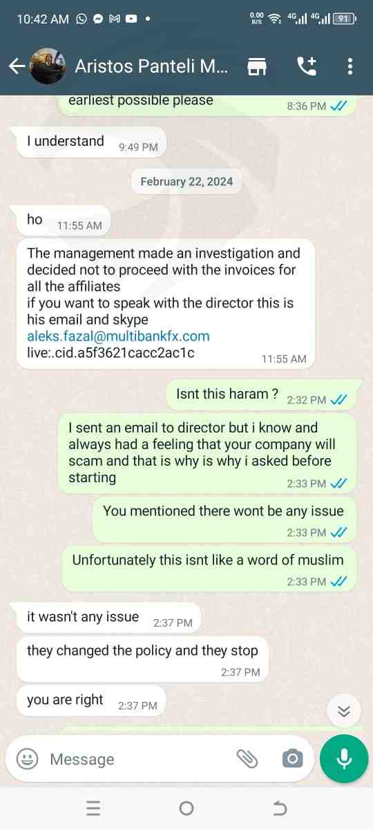 您好,我写信是为了举报 multibankfx 的诈骗行为,我曾是该公司的附属公司,公司本应在 2024 年 2 月支付我 4200 美元的佣金,但公司在没有任何电子邮件的情况下终止了合同,也没有回复任何电子邮件,我尝试了各种方法联系他们,但他们没有回应,请求 WIKIFX 介入帮助解决问题,附件是通过电子邮件和 whatsapp 与经理沟通的与公司的沟通,请帮帮我