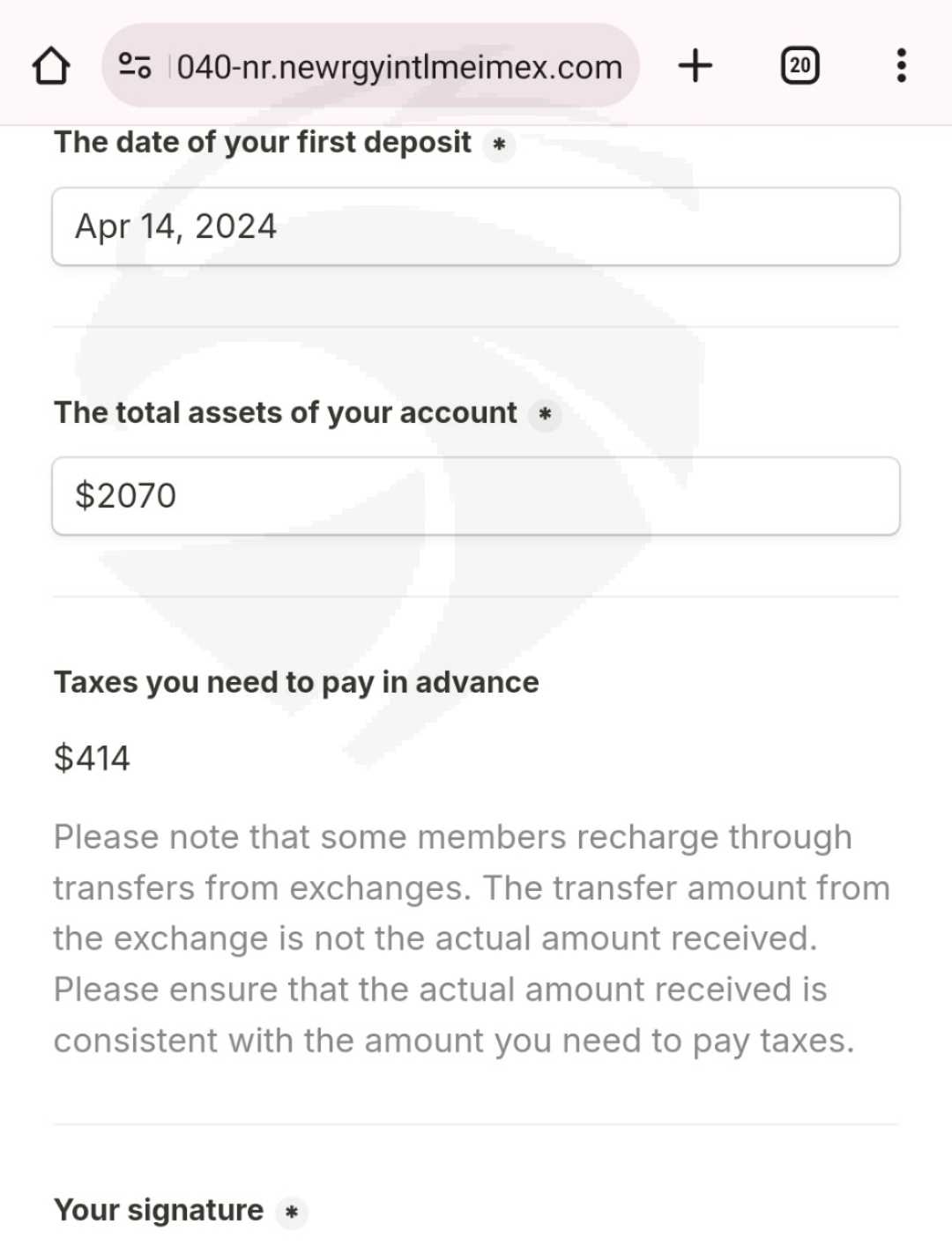 该平台不允许您提款,它已经消失了,它不允许您进入帐户,并且应用程序没有显示任何内容,当尝试提款时,它不允许并要求纳税