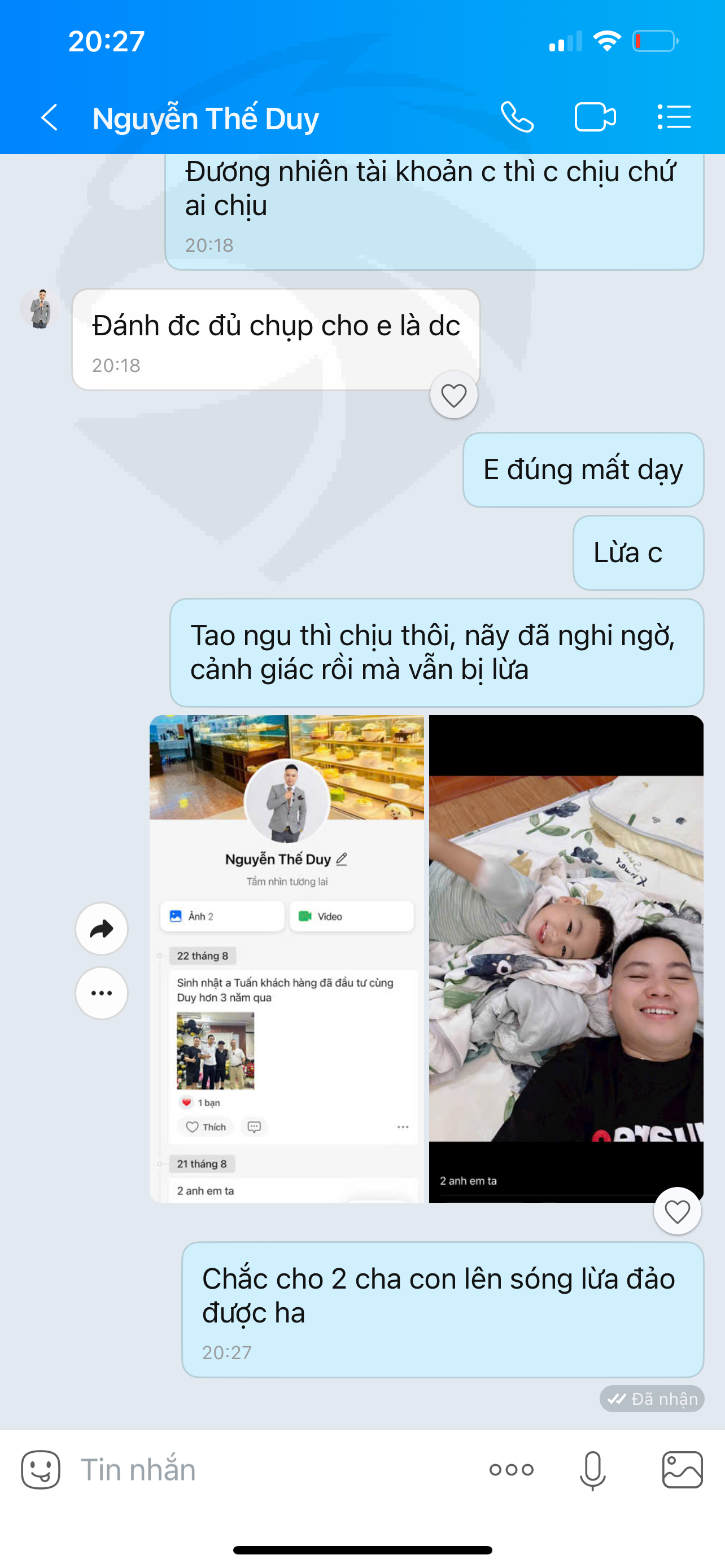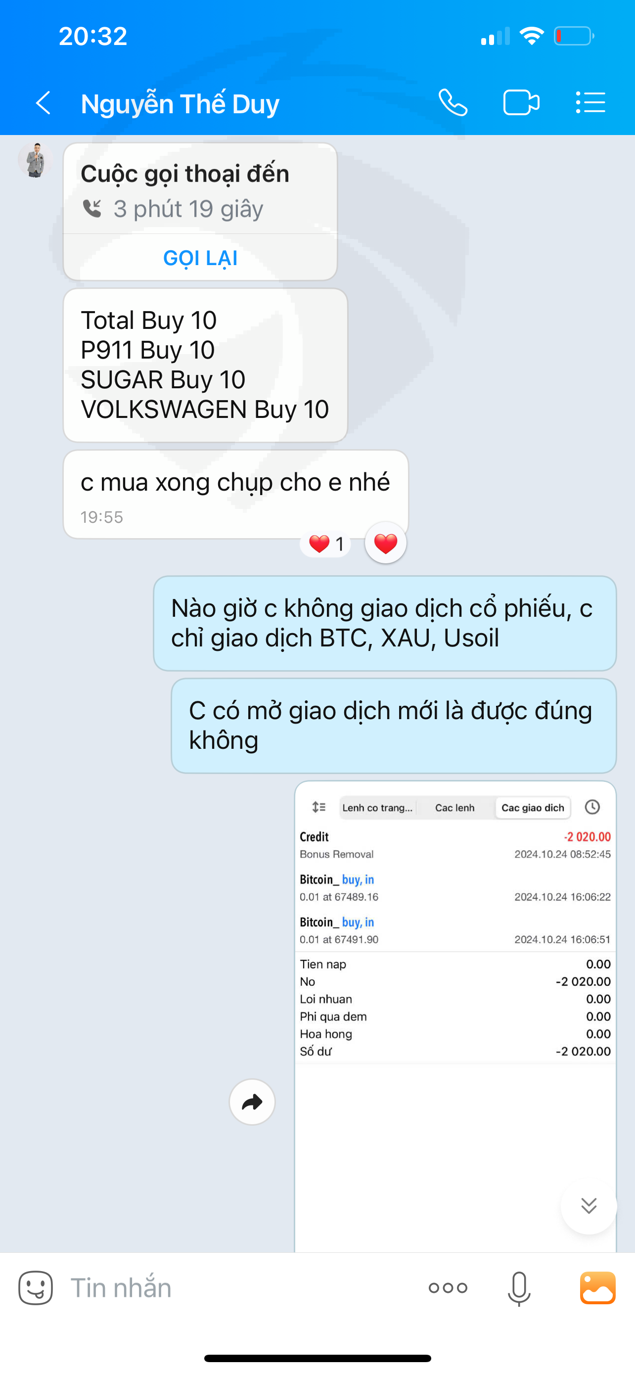 Tài khoản của tôi có hơn 11000$. Tôi thực hiện lệnh rút 3000$ nhưng không được giải quyết. Tôi liên hệ nhân viên tư vấn không được nên có nhắn tin qua bộ phận hỗ trợ trên web của sàn. Sau đó nhân viên tên Nguyễn Thế Duy gọi điện nói hỗ trợ tôi rút tiền, kêu tôi phải mua mã cổ phiếu mới xác minh tài khoản và cho rút tiền. Ban đầu tôi cũng nghi ngờ nhưng do tâm lý hơn tháng trời không rút được nên vẫn làm theo. Vừa mở lệnh mua mấy mã nó bảo là tài khoản bay sạch.