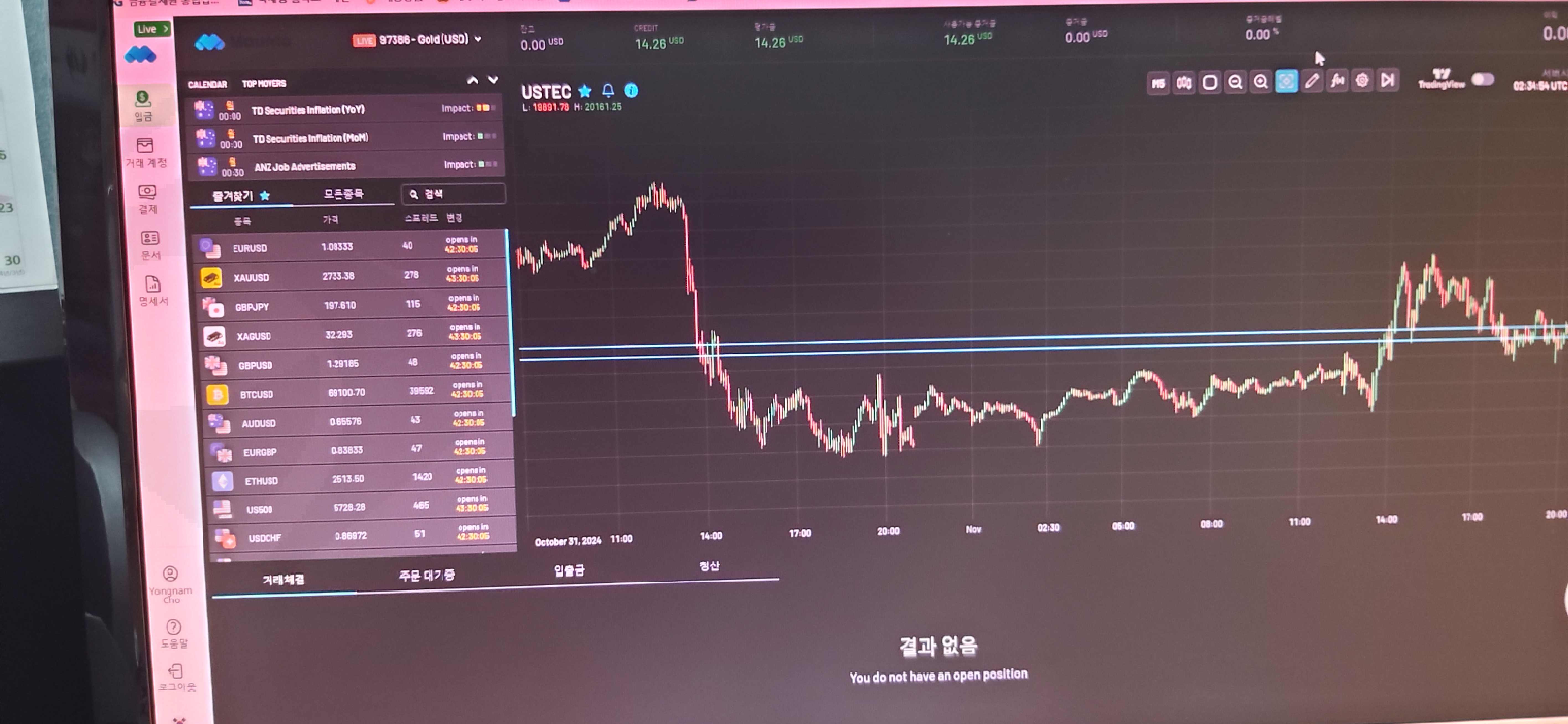 브로커관리자 권유로 거래체결종목은 AUDUSD(거래일 4일, 청산이익–3102), US500(거래일 18일, 청산이익–853), US30(거래일 21일, 청산이익–1768), NZDUSD(거래일 22일, 청산이익–719), XAGUSD(거래일 23일, 청산이익–2479), AUDUSD(거래일 23일, 청산이익–767), BRENT(거래일 29일, 청산이익–972), US500(거래일 30일, 청산이익–415), XAUUSD(거래일 30일, 청산이익–2233), USTEC거래일 30일, 청산이익–3261)은 브로커관리자 권유로 거래체결를 하였으며, 투자자 거래체결종목은 USTEC거래일 30일, 청산이익–1653), USTEC거래일 30일, 청산이익–1640), USTEC거래일 30일, 청산이익–1612), USTEC거래일 30일, 청산이익–1552)은 투자자가 직접 거래체결한 것으로 10월 30일 잔고가 13,035달러였고, 크레딧이 10,000달러인 상태에서 10월 31일 갑짜기 한꺼번에 stop out되어 버렸다. 현재 잔고는 0달러인데 그 동안 마운토(브로커)관리자 권유로 현재까지 투자입금한 총합계 금액은 23,021달러(33,663,703원)인데 모두 날라가 버렸다.