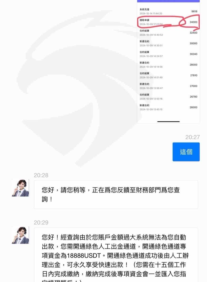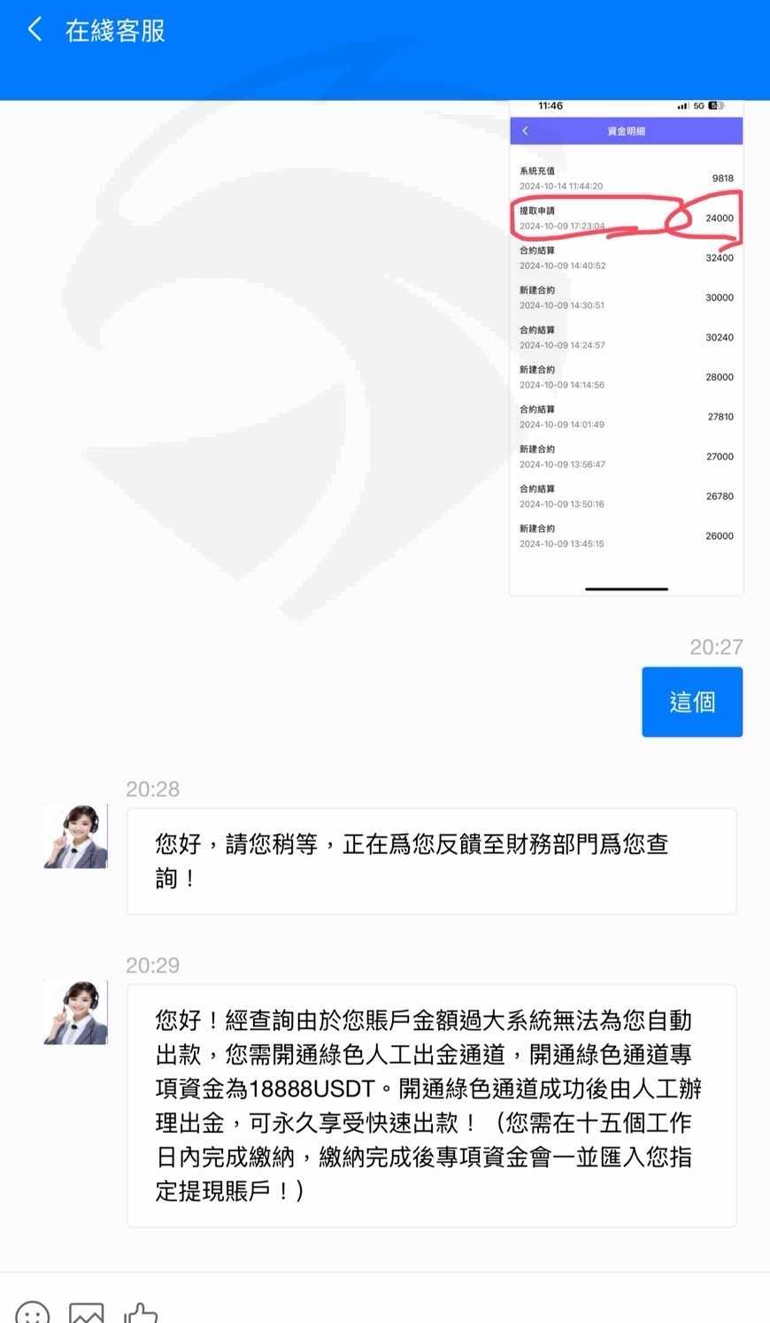 第二次說 提領金額過大要開啟綠色通道 18888 USDT