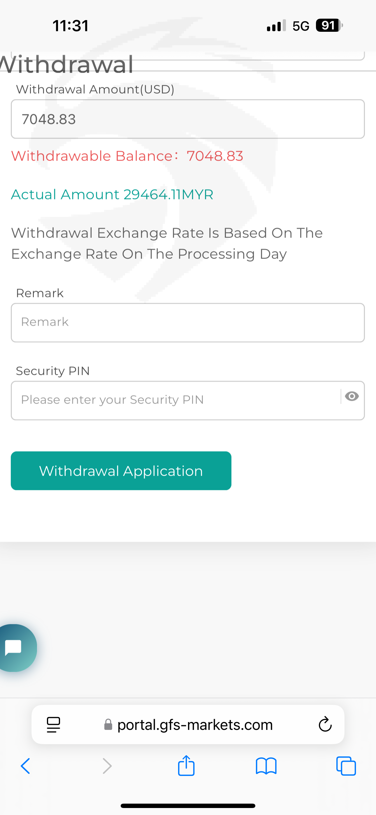 At the time of withdrawal, I had 7,048.83 USD left, which was converted to MYR at 29,464.11.