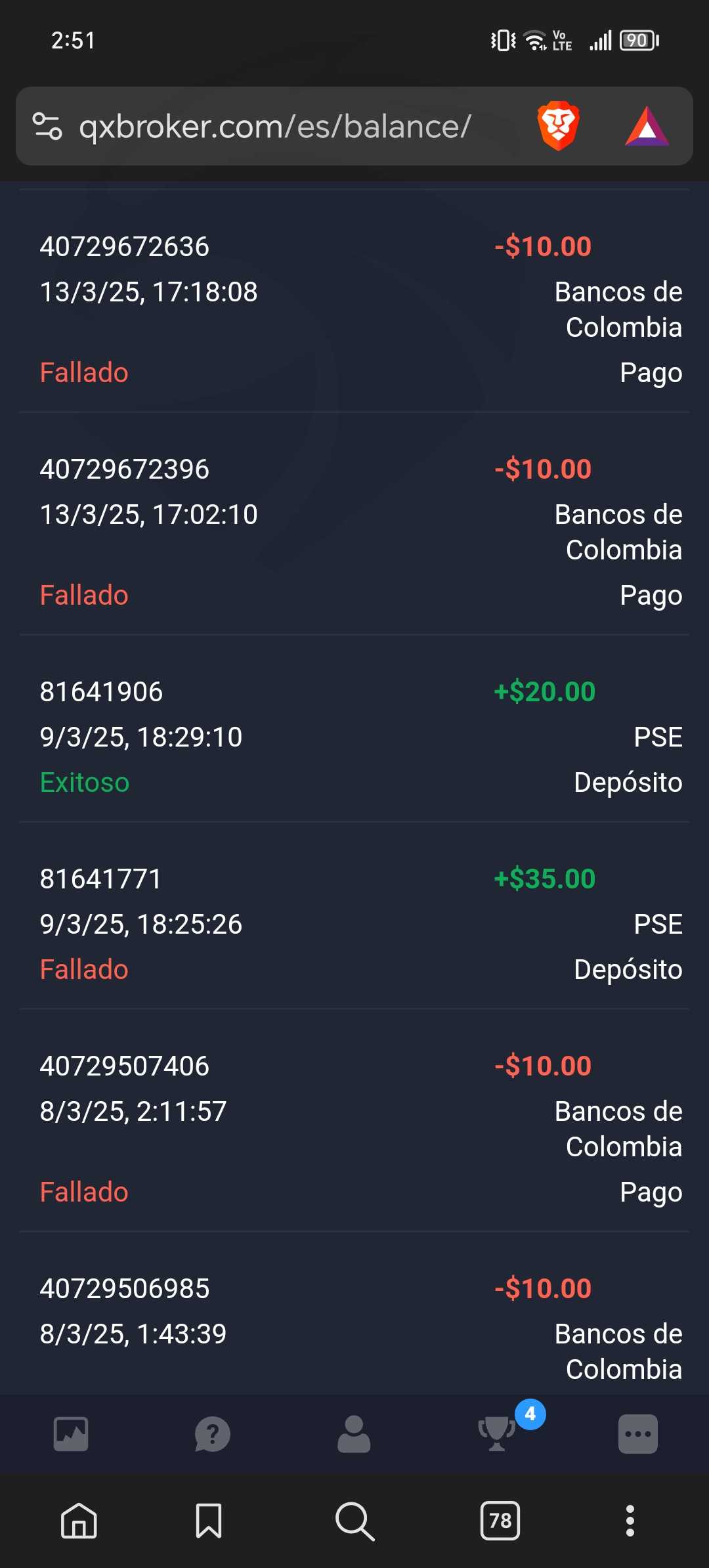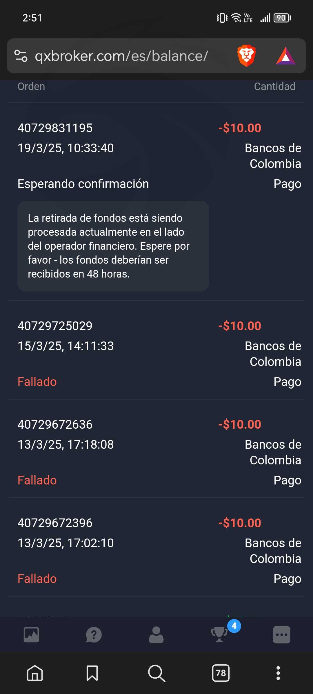 我曾尝试通过 Nequi、Daviplata、银行账户提款,但没有任何反应,他们让我等 3 天或更长时间才能再试一次。如果您已经有请求,他们将不允许您撤回。我有更多的钱,但是当我看到无法提取时,我犯了一个错误,继续操作,想着至少可以增加资本,但结果更糟了。他们唯一的回答就是我应该等待。
