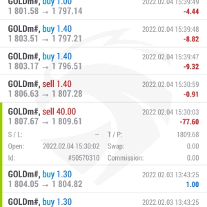 2022年2月4日9:15,我在 1810-1812 附近设置了卖出止损(我不确定具体在哪里,因为我一直在调整它)并将止盈设置在1808.. 但是XM在我的交易1707左右开盘,然后在涨到 1809 时平仓。除此之外,开盘价太低,他们也收盘价太高,这不是我赢得交易,而是输掉了交易。我期待滑点,但没有这么多。我附上了证据,如果你把1807作为入场,1809作为止盈,你不能设置止损