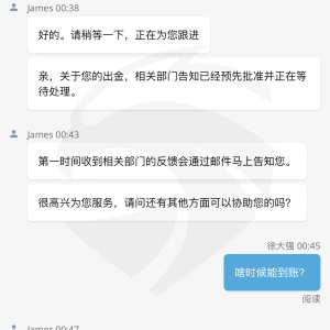 出金10-500000U,我才出3.8万就卡主了!多次沟通就一句话我们会处理的,但是一直没结果!