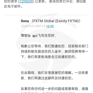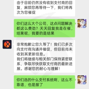 9月1日上午申请入金500美金,提交入金申请后,支付系统提示无法匹配订单,请求重新提交,造成多次入金申请记录,直到匹配上订单,按订单信息在规定时间内转账,结果一直未到账,联系客服,客服告知已将问题反馈给支付商,但支付商没有回复,让耐心等待,都10多天了,一直是这样的回复,说实话使用该券商5年多了,第一次遇到这种情况,希望平台尽快解决。